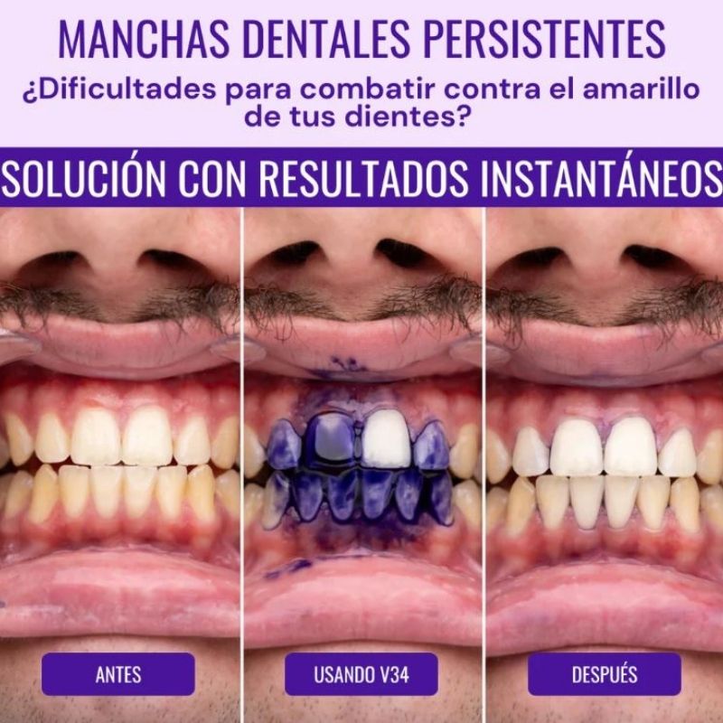El blanqueador y corrector del color V34 es perfectamente seguro, ya que es una forma de blanqueamiento no abrasiva. Sin embargo, recomendamos evitar aplicarlo directamente sobre estos dientes, ya que solo los dientes naturales pueden ser corregidos en cuanto al color.
